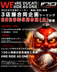 『ドゥカティ岡崎』、『ドゥカティ浜松』、『ドゥカティ静岡』3店舗合同ツーリング、100人規模の記念撮影を行います!
