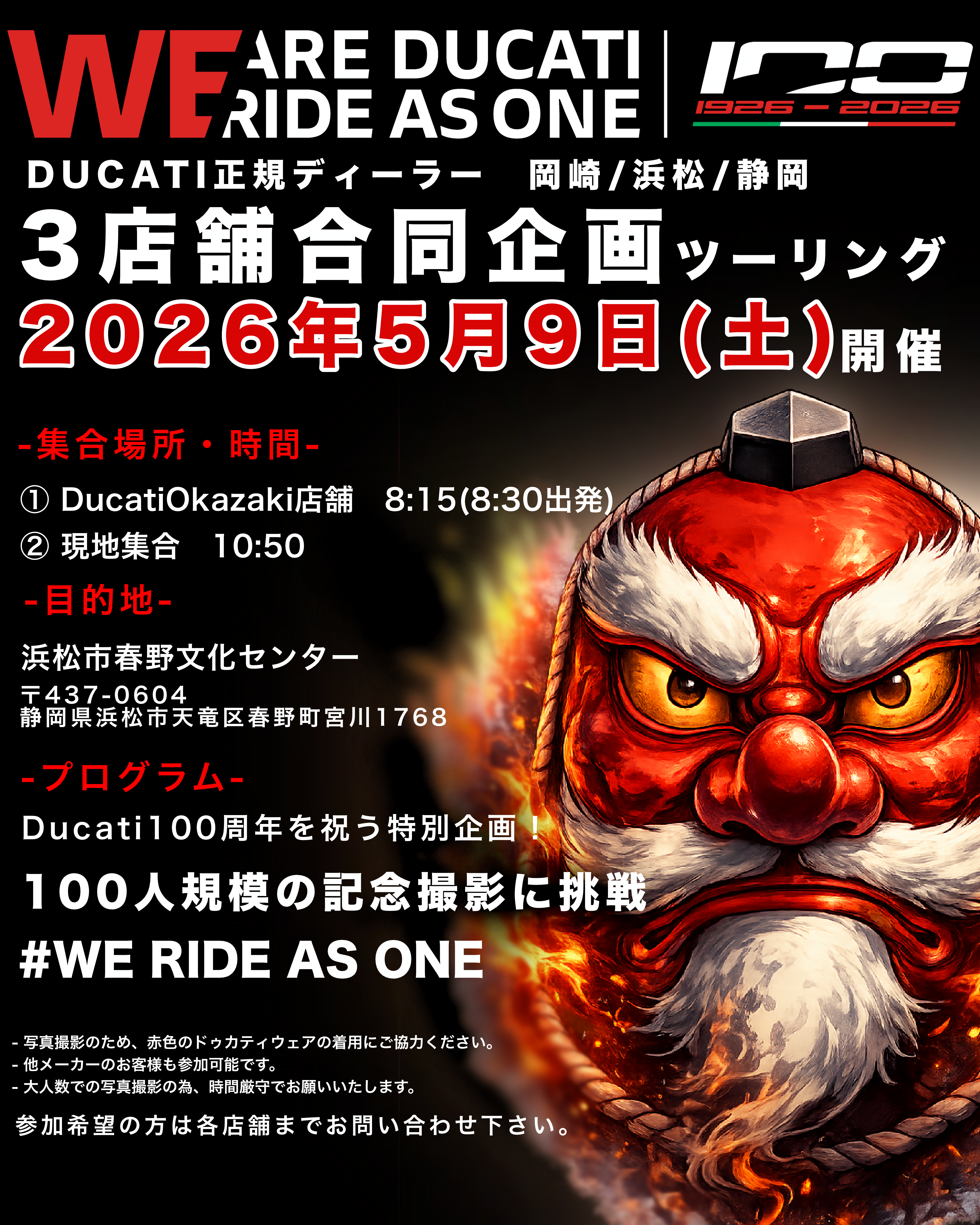 ・撮影に伴い、参加者の皆様におかれましては「赤色のドゥカティアパレル」の着用にご協力ください🙇♀️